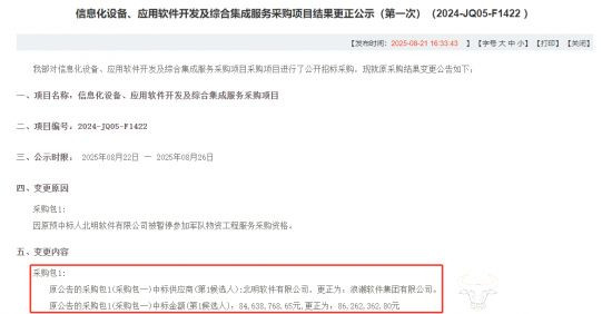 然而,8月21日,某单位采购网突然发布了项目结果更正公示(第一次),北明软件的预中标资格被废,是出了什么事?